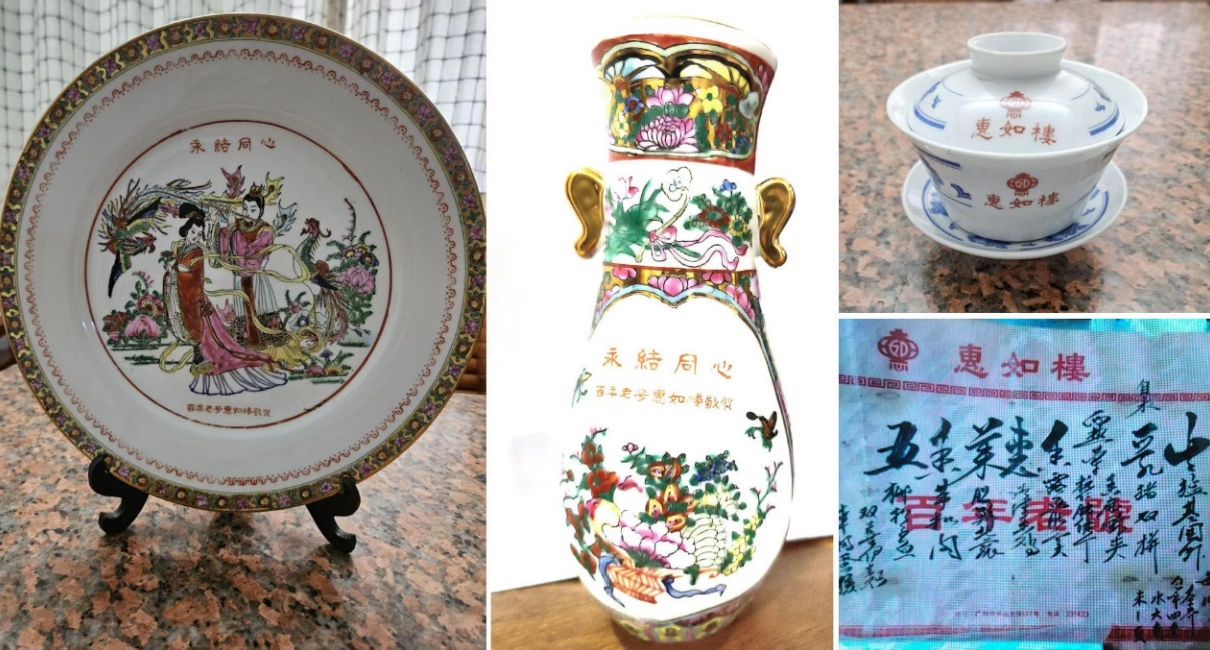开业现场,还展示了老职工们珍藏多年的惠如楼历史“见证物”。举例,原惠如楼为庆贺新东谈主成亲宴而相配定制的广彩瓷器(瓷碟与瓷瓶),图案喜庆祯祥,承载着老茶肆对主顾的浓浓道贺;还有昔时用于冲泡工夫茶的经典焗盅,仿佛还氤氲着旧日的茶香;更有一份原惠如楼买卖部主任书写的、用于婚宴等紧迫宴席的羊毫手写菜单。