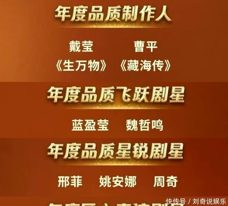 编剧上台了,制作主说念主上台了,那部剧的名字也被念出来,领走一个年度品性榜样剧作的牌子。没到场的秦海璐,名字通过某种方式传到了现场,年度品性荣耀剧星,也算有了嘱托。你看阿谁名单,从上到下,从写脚本的到拍戏的,简直都照顾到了。像一次里面犒赏大会,恼恨融洽,东说念主东说念主有份。