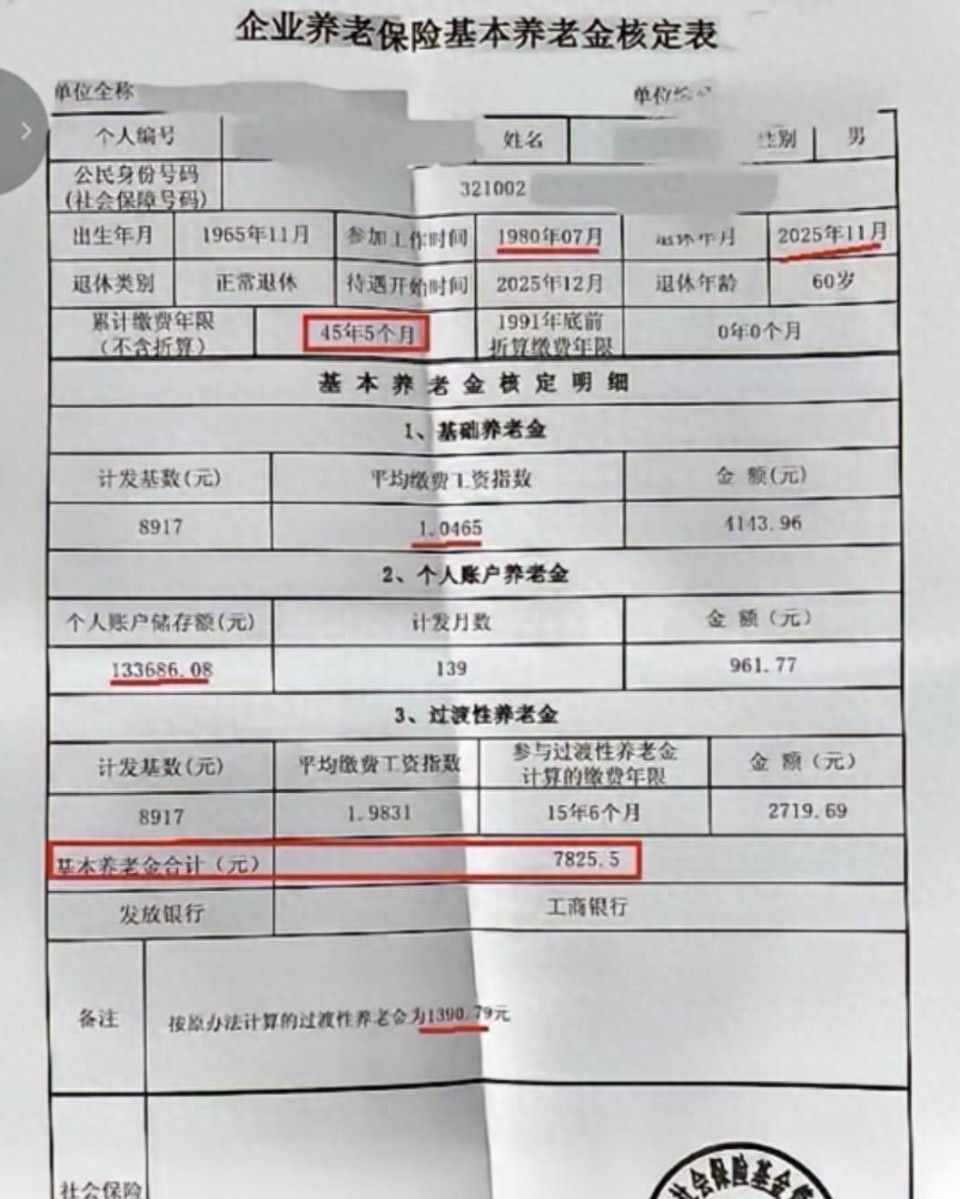 一位在江苏企业职责了45年5个月的员工开云官网登录入口,2025年11月退休时,待业金顽强表上的数字是7825.5元。 他的养老保障个东谈主账户里积存了13.36万元,平均下来,每个月从个东谈主账户里领到的钱是961.77元。