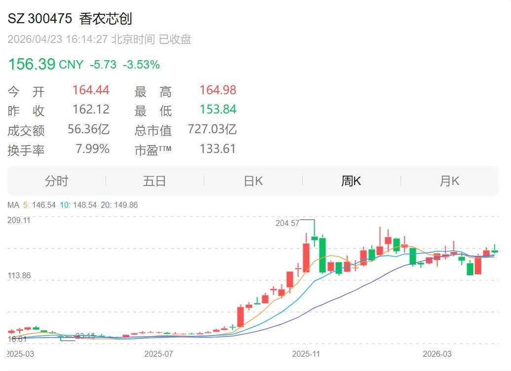 收场4月23日收盘,香农芯创股价报156.39元/股,总市值727.03亿元。